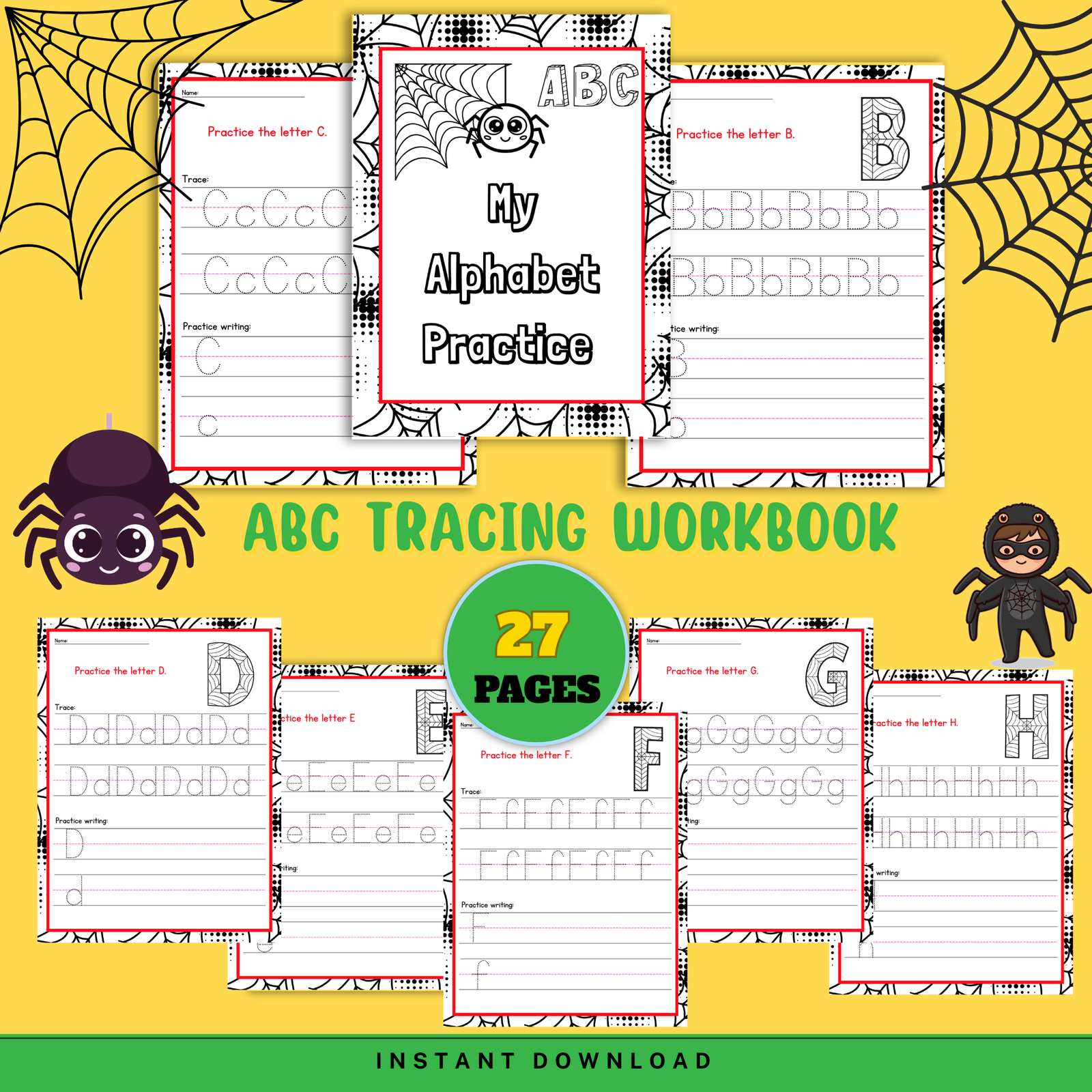 27-page ABC tracing workbook spider theme for preschoolers. Fun letter tracing with spider and web designs. Instant digital download in PDF format.