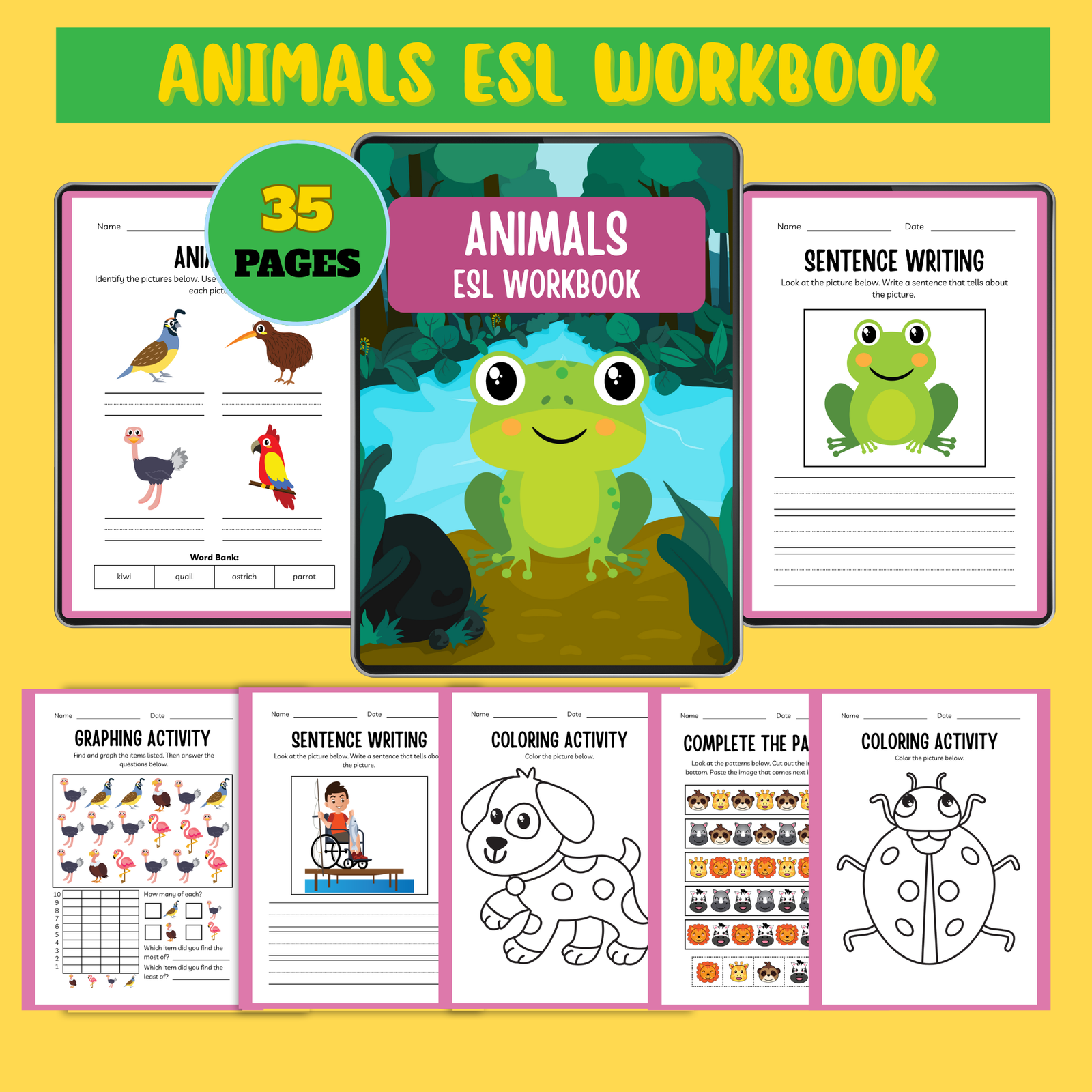 A 35-page Animals ESL Workbook packed with fun activities, vocabulary, writing, and coloring for young English learners.