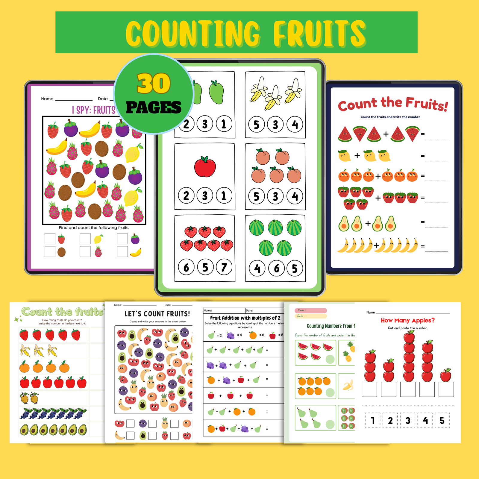 ✅ 30 printable pages of fruit counting fun