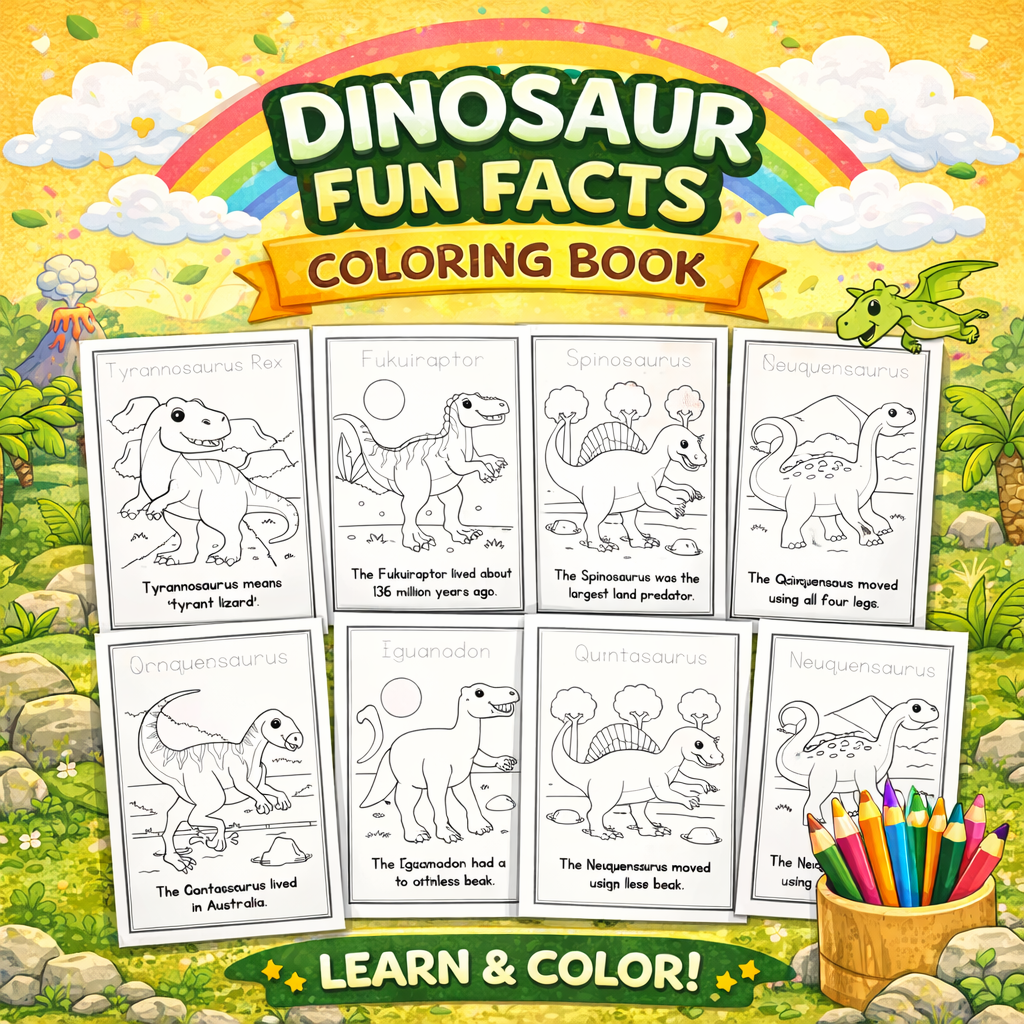 Make learning exciting with this engaging Dinosaur Coloring Book with Fun Facts! This 30-page printable activity book combines fun coloring with educational content, helping kids discover fascinating dinosaur facts while they color.