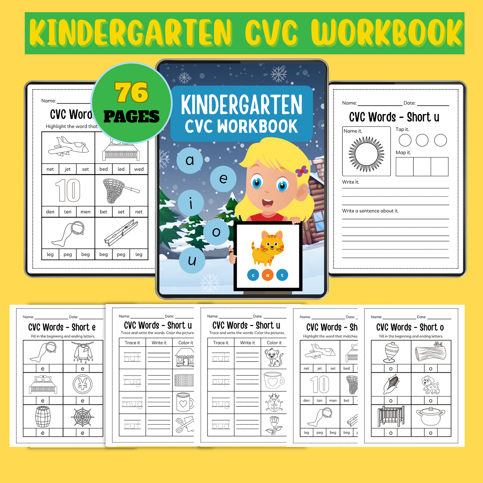 76-page Kindergarten CVC Workbook with phonics activities, short vowel practice, and early reading exercises.