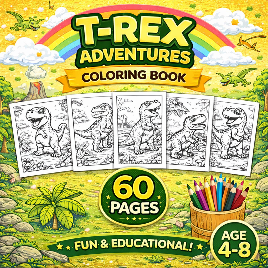 60-page T-Rex Dinosaur Coloring Book for Kids with fun and detailed printable dinosaur coloring scenes.
